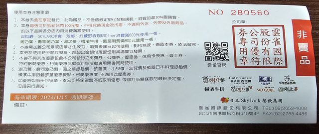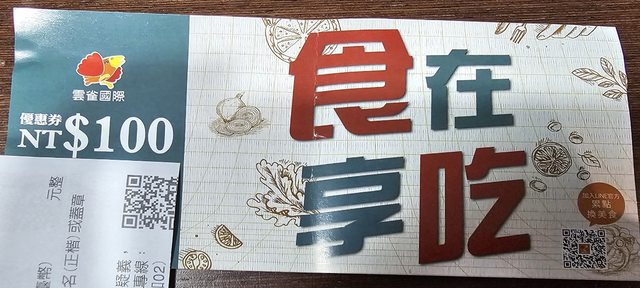 物品名稱:雲雀集團 百元折價卷 (古拉爵、涮乃葉均可使用)