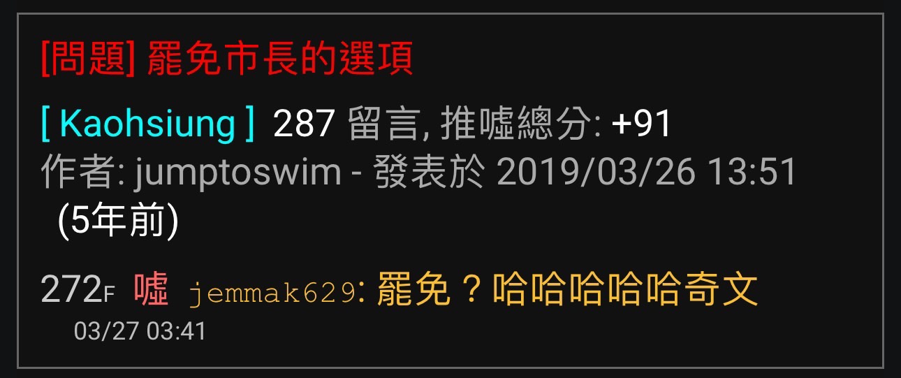 推 CapooCat : jo大 當初jemmak629這位大大也是說幹嘛罷免韓 還很 07/27 01:18