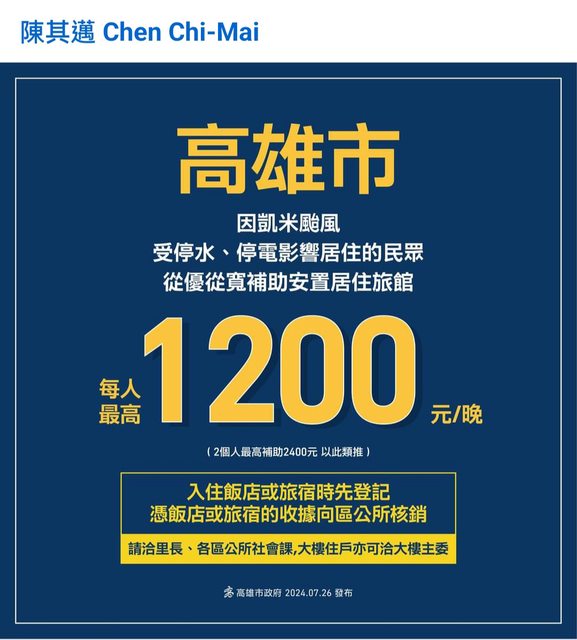 因凱米颱風受停水、停電影響居住的民眾,市府從優從寬補助【#安置居住旅館】,減輕市 民不便及負擔 → https://pse.is/69lv6f 每人每晚最高 1200 元,2個人每晚最高補助 2400 元,以此類推 自發布凱米颱風警報當日(7/23)起算,受災戶只要入住飯店或旅宿時先登記,憑飯店或 旅宿的收據,就可以向各區區公所進行核銷 請洽 #里長、#各區公所社會課,大樓住戶亦可洽 #大樓主委 協助 希望在恢復供電供水之前,讓受災戶至少可以有一個比較安穩住宿的環境,在這段時間能夠 盡量減低市民不便。 查詢區公所:https://bit.ly/3GS9g4U 新聞稿:https://pse.is/69lwh8 ---- Sent from BePTT -- ※ 發信站: 批踢踢實業坊(www.ptt-site.org.tw), 來自: 101.136.80.192 (臺灣) ※ 文章網址: https://www.ptt-site.org.tw/Kaohsiung/M.1721995449.A.CBB