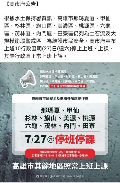 【高市府公告】 根據水土保持署資訊,高雄市那瑪夏區、甲仙區、杉林區、旗山區、美濃區、桃源區、六龜 區、茂林區、內門區、田寮區仍列為土石流及大規模崩塌警戒區,為維護市民安全,高市府 宣布上述10行政區明(27)日(週六)停止上班、上課,其餘行政區正常上班上課。 https://i.imgur.com/Sq6T5U1.jpeg