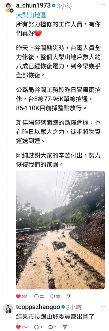 ceca : 明霸克路橋那個本來就是斷的,還沒重建好又被沖掉. 07/27 16:07
