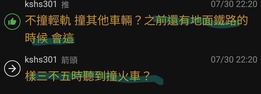 kshs301 : 樣三不五時聽到撞火車? 07/30 22:20