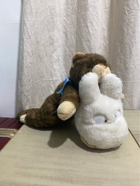 物品名稱:白色豆豆龍玩偶和貓咪玩偶