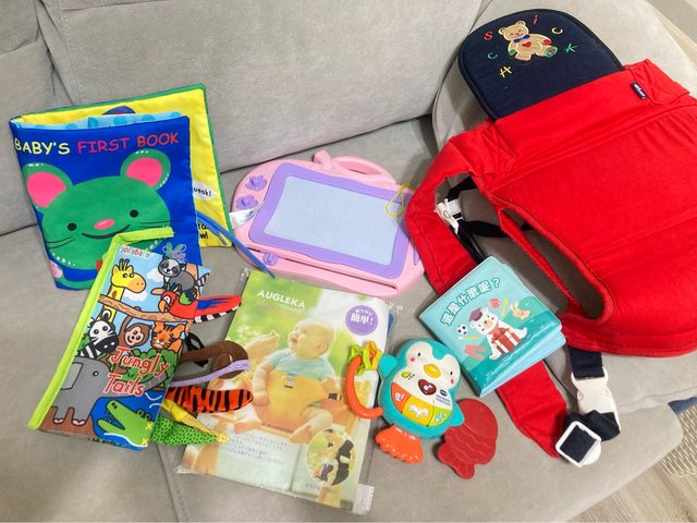 物品名稱:嬰幼兒布書、玩具、輕便揹巾、座椅安全帶(全新)