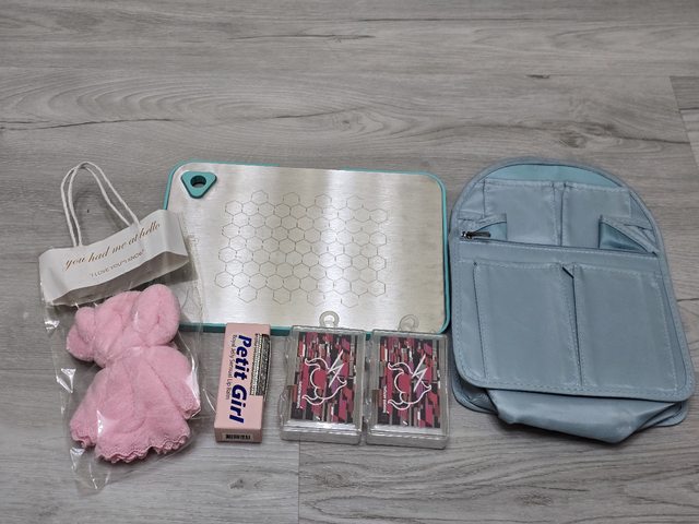 袋中袋、不鏽鋼砧板、唇膏、手帕、收納盒