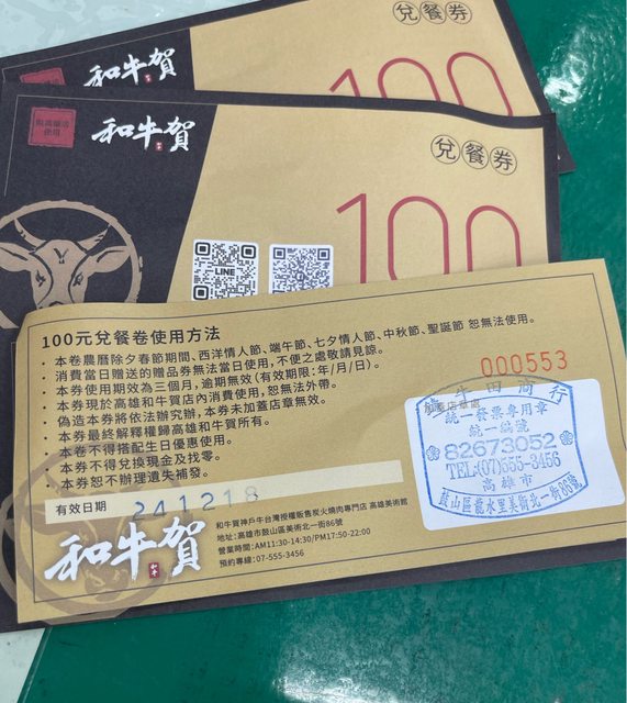 和牛賀餐券100元4張