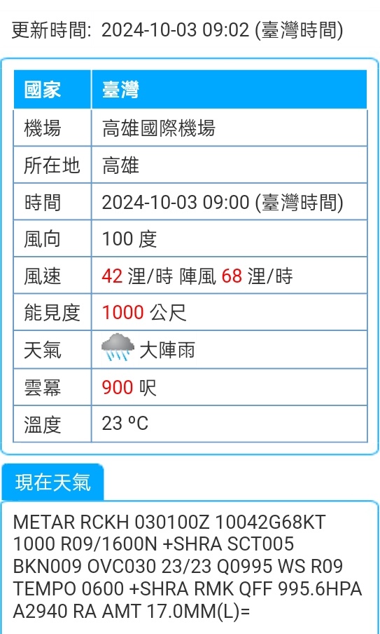 推 sunchen0201 : 小港目前風強雨大,很恐怖。 10/03 09:36