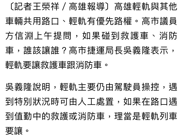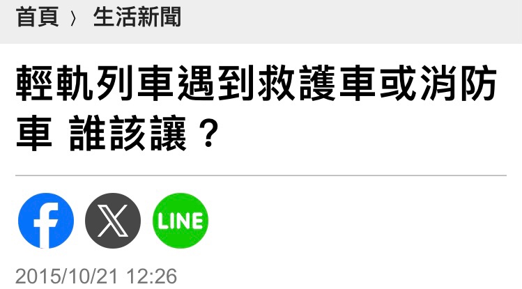 → saika0987 : 我看過輕軌讓執勤的救護車 不知道誰的路權大? 10/12 01:46