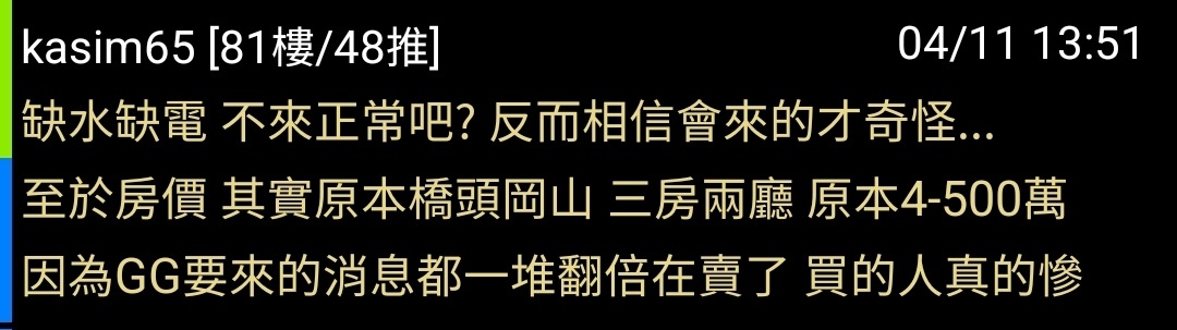 sanwan : 中立選民:高雄都沒看到台積電有在蓋。又是在炒房, 10/17 18:56