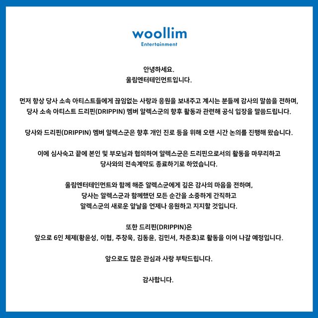 Woollim 娛樂於 28 日宣布了 DRIPPIN 成員 Alex 退團的消息 ,以下為 Woollim 娛樂