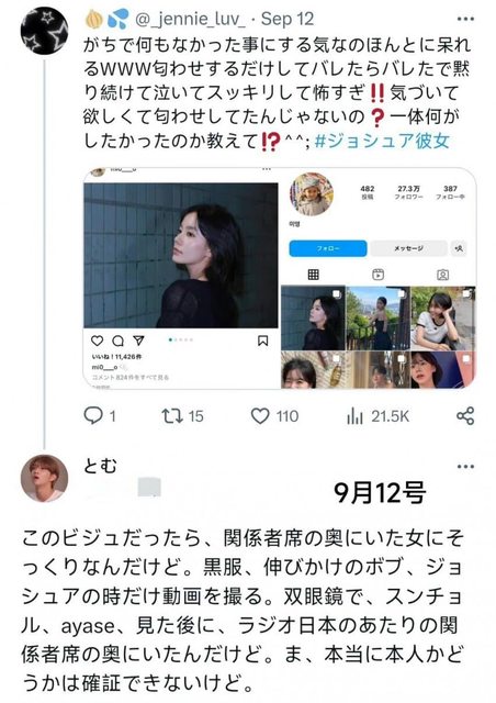 日本粉絲9/7號在推特發文說在相關人員座位區看到3個女生 有一位穿黑衣+短髮的女生在Joshua撒嬌或者是說話的時候都在拍攝 是Joshua女朋友嗎? https://i.imgur.com/NJcTtej.jpg
