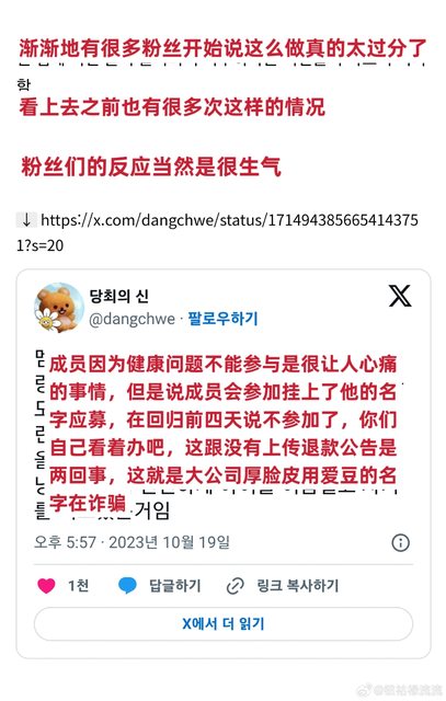 翻譯來源 https://weibo.com/5607032695/NoHIw2SD4 --- https://www.kagit.kr/posts/140236 對此就有粉絲不滿表示,在開簽售會前公司也早已知道成員是否能繼續進行回歸活動,換 言之,成員的健康狀態與身體恢復情形是公司早就已經知道的事,為了卻要選在回歸前兩 天才通知,甚至是選在簽售會已經開賣也截止後才公布,讓許多粉絲認為公司為了銷量刻 意拖延公告日期。 該名粉絲認為,由於每買一次簽售都是不小的金額,甚至是花上大筆的積蓄去抽簽售,就 算不是團飯也是為了可以見到自己喜歡的成員,因此公司疑似為了銷量而隱瞞粉絲,刻意 推延公告讓許多粉絲爆氣,「好好的公告有很難嗎?」、「想賺錢的野心太大了,尤其是 在被HYBE收購後更嚴重了呢」、「真的好過分」、「簽售又不是只開一兩場,這樣真的很 像在詐騙粉絲」、「當然要事先告知吧?哪有人去掉成員後才說的,真的很騙欸」引起許 多不滿。 -- ※ 發信站: 批踢踢實業坊(www.ptt-site.org.tw), 來自: 1.160.224.220 (臺灣) ※ 文章網址: https://www.ptt-site.org.tw/KoreaStar/M.1697817338.A.959