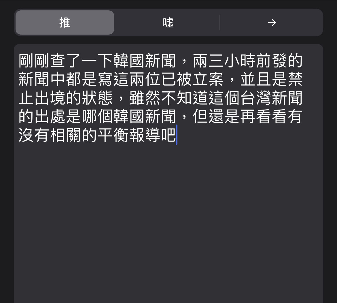 感謝下方板友推文跟指教,看起來又是一起幾手資料的媒體報導 又是傳聞又是翻譯,或是爬文翻影片蒐證等等 看到好像還是有網友轉發,所以就還是不刪文了 坐等後續囉,無論如何看起來也都需要時間等待 為防又有人爬文誤會,重要事情說三遍! 推文討論就不刪了~ 已由網友資料提供證實為錯誤翻譯報導訊息 已由網友資料提供證實為錯誤翻譯報導訊息 已由網友資料提供證實為錯誤翻譯報導訊息 新聞原出處:https://www.nownews.com/news/6290197 -- ※ 發信站: 批踢踢實業坊(www.ptt-site.org.tw), 來自: 114.46.230.157 (臺灣) ※ 文章網址: https://www.ptt-site.org.tw/KoreaStar/M.1698552290.A.7E9
