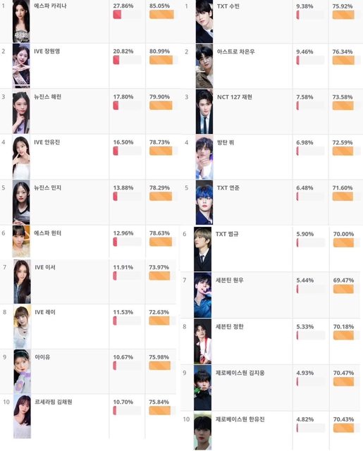 女偶像 1. aespa Karina 2. IVE 張員瑛 3. NewJeans 諧潾 4. IVE 安俞真 5. NewJeans 玟池 6. aespa Winter 7. IVE 李瑞 8. IVE Rei 9. IU 10. LE SSERAFIM 金采源 男偶像 1. TXT 崔秀彬 2. ASTRO 車銀優 3. NCT 127 在玹 4. 防彈少年團 V 5. TXT 然竣 6. TXT 杋圭 7. SEVENTEEN 圓佑 8. SEVENTEEN 淨漢 9. ZB1 金地雄 10. ZB1 韓維辰 來源: theqoo https://theqoo.net/square/3025255373 1. 小學生總統們都聚集在一起了呢 2. IU上榜真了不起 3. 國中男生真的超級喜歡諧潾 4. TXT 我去演唱會的時候真的看到很多小朋友 5. 我喜歡的類型全部都在這裡.. 6. TXT真的是小學生總統沒錯 7. 上榜的是四代女團還有IU,IU的排名真的一直都很穩 8. 我之前看到這個有問我姪子 他說IVE和TXT很受歡迎,然後最漂亮的人是Karina 9. 小朋友啊,大人也喜歡Karina.. 10. 沒錯,TXT 100%是10代的pick 11. 連奶奶們也知道車銀優 車銀優的認知度是不分年齡層的 12. 果然是TXT... 王子殿下們 13. 金地雄居然是10代pick? 14. 男偶像都是帥哥,女偶像也都是美女 感覺小朋友很明顯是看臉 15. 這個是10代的pick耶,IV和V有上榜很神奇 來源:韓網評論翻譯站 -- ※ 發信站: 批踢踢實業坊(www.ptt-site.org.tw), 來自: 134.208.60.187 (臺灣) ※ 文章網址: https://www.ptt-site.org.tw/KoreaStar/M.1701785637.A.F0A