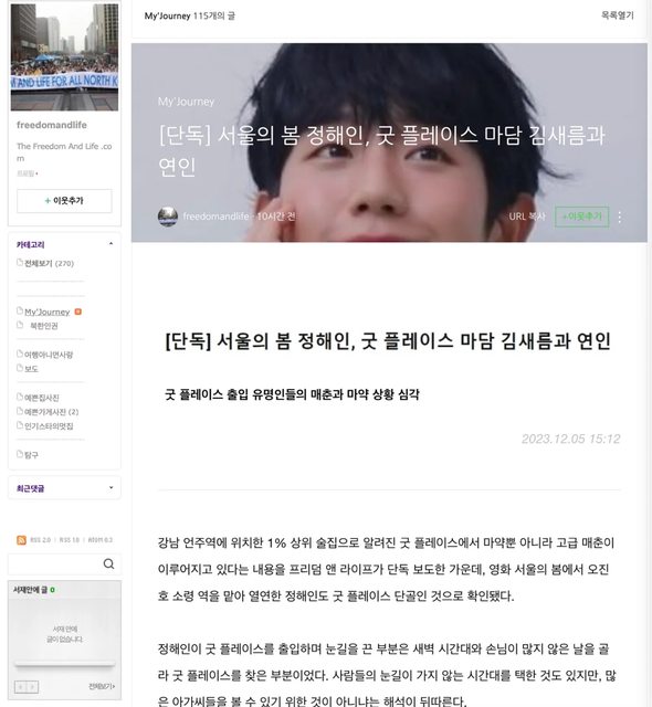 韓博主「freedom and Life」昨(5日)爆料丁海寅是酒家常客,並表示向丁海寅求證遭 拒。(截圖自naver網站) 酒家「Good Place」就是傳出李善均、GD去的聲色場所,而金南熙就是涉嫌勒索李善均鉅 額金錢遭警方拘留,也就是李善均情人的那位「酒店室長A女」。博主爆料相關人士提供 情報,聲稱丁海寅為避免被認出,刻意選擇凌晨的時間去酒家。爆料人還說,丁海寅與金 南熙的親姐姐金賽凜(音譯)是戀人關係,而金賽凜也是該酒家室長之一,也接待客人, 丁海寅也是因為這樣才去「Good Place」https://i.imgur.com/YYYNZj3.jpg