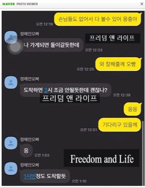 韓博主公開據說是李善均情人金南熙與丁海寅在9月1日凌晨的的對話紀錄。(截圖自nave r網站) 由於金南熙涉毒,令人好奇丁海寅與金賽凜有無接觸毒品,爆料人說金賽凜不碰安非他命 ,「但她可以說是咬著大麻過日子。」也不曉得是否兩人會一起呼麻。「freedom and Li fe」向丁海寅方求證相關爆料,遭拒絕回應。 https://i.imgur.com/U4Zb7X0.jpg