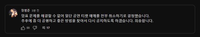 (圖片翻譯:因無法解決黃牛票問題,決定暫時全部取消演出門票預售。以後我會找到更公