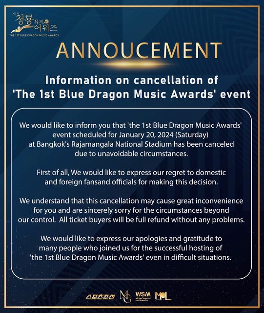 來源:https://x.com/mgconnext/status/1743207636504543368?s=46&t=abJBnmH-w2Kh0u6H cKcZug 第一屆青龍音樂大獎於原訂於2024 年 1 月 20 日在泰國曼谷拉加曼加拉體育場舉行。當時 據主辦方表示會有超過 100 名的 KPOP 藝人和明星參與此場盛事。 https://i.imgur.com/BNNxy4a.jpg