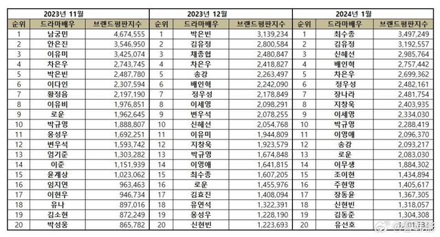 韓國企業評價研究院對2023年12月9日至2024年1月9日播出的電視劇中的50名演員的60,50