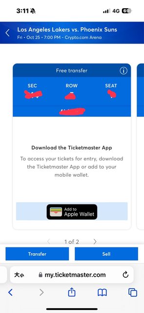 我是經由vivid seat購入10/25太陽作客湖人的比賽,mail收到後要在ticketmaster