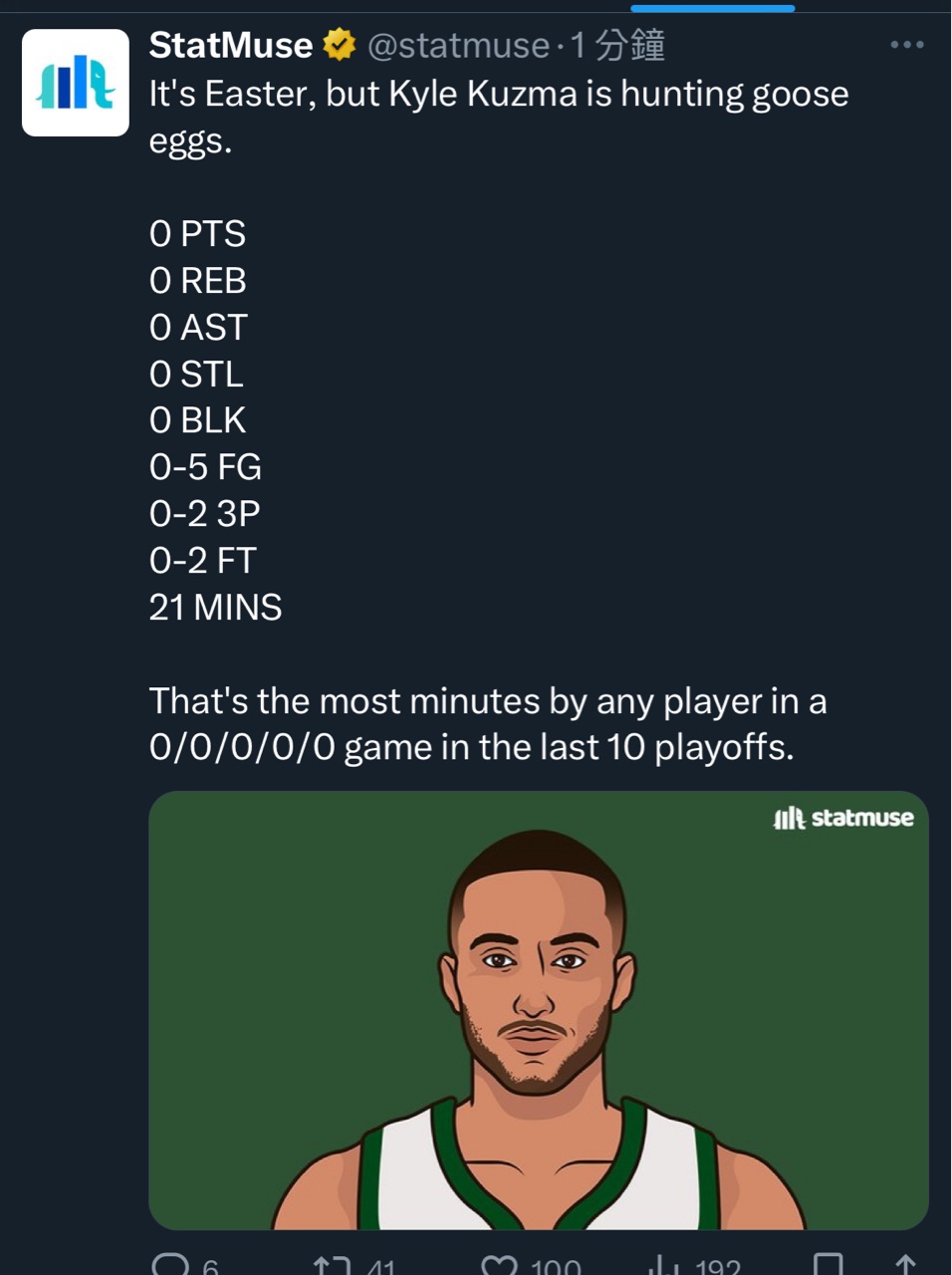 推 evangelew: 公鹿打到第二節快結束,只投進兩顆三分,還真慘。 04/20 02:15