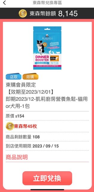推 wi22900: 東森幣換的寵物食品建議去門市看有貨才換 1.200.244.214 08/14 14:24