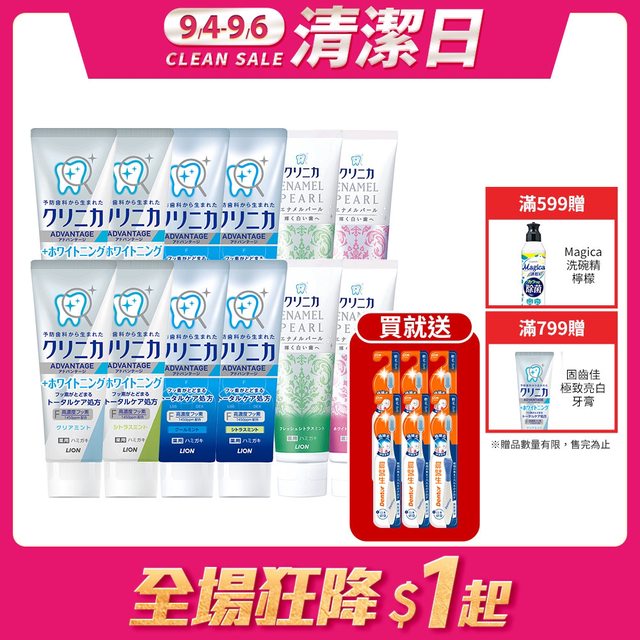 送晨醫生牙刷*6+固齒佳酵素極致亮白牙膏 130g*1+獅王Charmy Magica濃縮洗潔精 檸檬 22