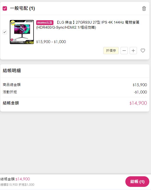 推 sfly1119: 目前momo好像沒有折1000了 27.53.144.114 10/24 19:47