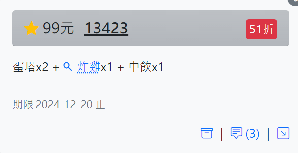 → baozi: 可以貼個28元買13423 多一個蛋塔跟小飲 1.162.241.85 06/21 11:06