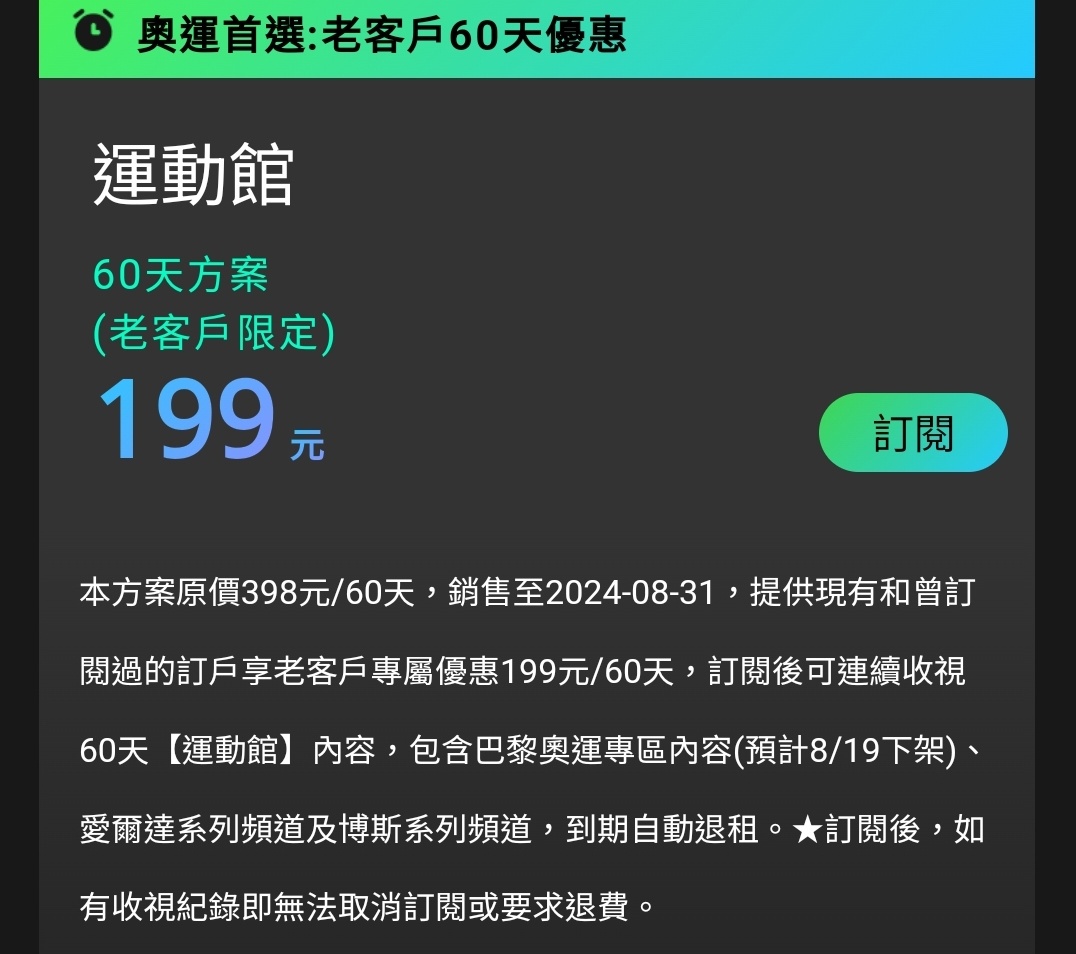 推 balanokia: 因為只想看奧運 不需要199兩個月 118.232.41.7 07/29 15:10