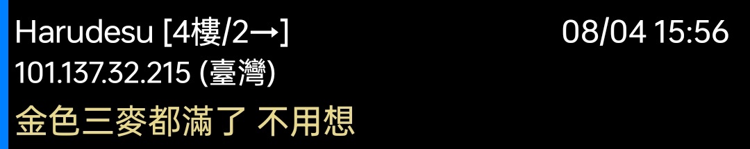 → DMC: 我查LINE,美麗華的金色三麥還有位置可以訂! 123.194.132.91 08/04 16:02