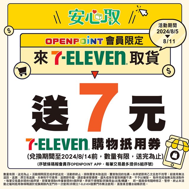 8/5~8/11取貨還有送7元7-11購物抵用券