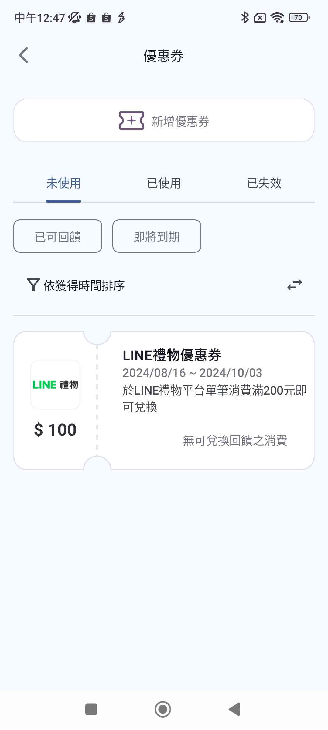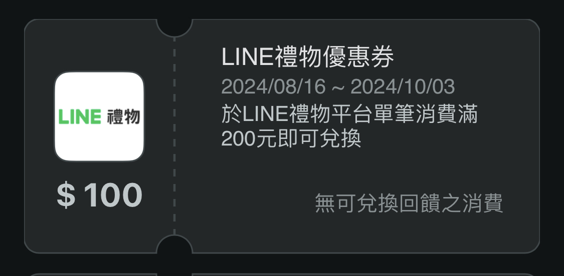 推 a910n242: 我買line禮物的,早上發券兌換了 49.217.60.7 08/20 15:33