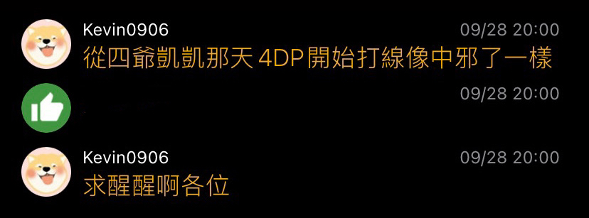 推 Madelaine: 有人說四爺和靖凱打DP開始衰的喔 09/29 20:51
