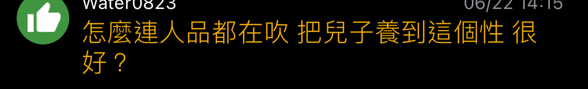 推 Water0823 : 怎麼連人品都在吹 把兒子養到這個性 很好?06/22 14:15