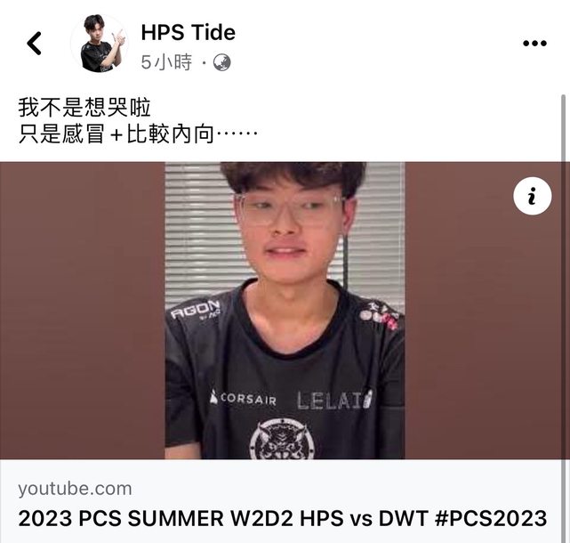 https://youtube.com/shorts/qxJ95Zhm8jA?feature=share 突然發現現在PCS會有賽後採訪 雖然才一下子的影片 幫大家用逐字稿 T:我是HPS下路 Tide N:恭喜你們終於取得夏季賽的首勝,這個也是你們在人員更換後拿到的第一場勝利,你自己 的心情怎麼樣? T:ㄜ…可能心情沒有到大家想的那麼好吧,就好像原本要採訪的統神,賽後檢討他也是急著 去檢討,所以放我一個來採訪 對 就這樣 很短 看起來Tide心情不是很好 感覺快哭快哭的 辛苦Tide了 加油! 然後這Tide說只是感冒加內向 好啦加油 我十年HPS粉 希望你們能越來越好 https://i.imgur.com/S5EFDqD.jpg