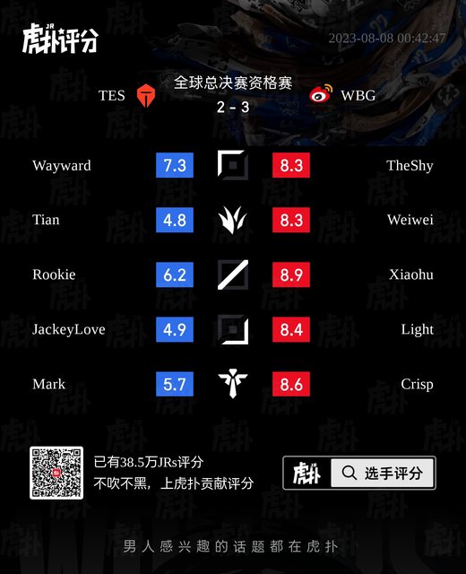 標題[閒聊] TES vs WBG 虎撲賽後評分表