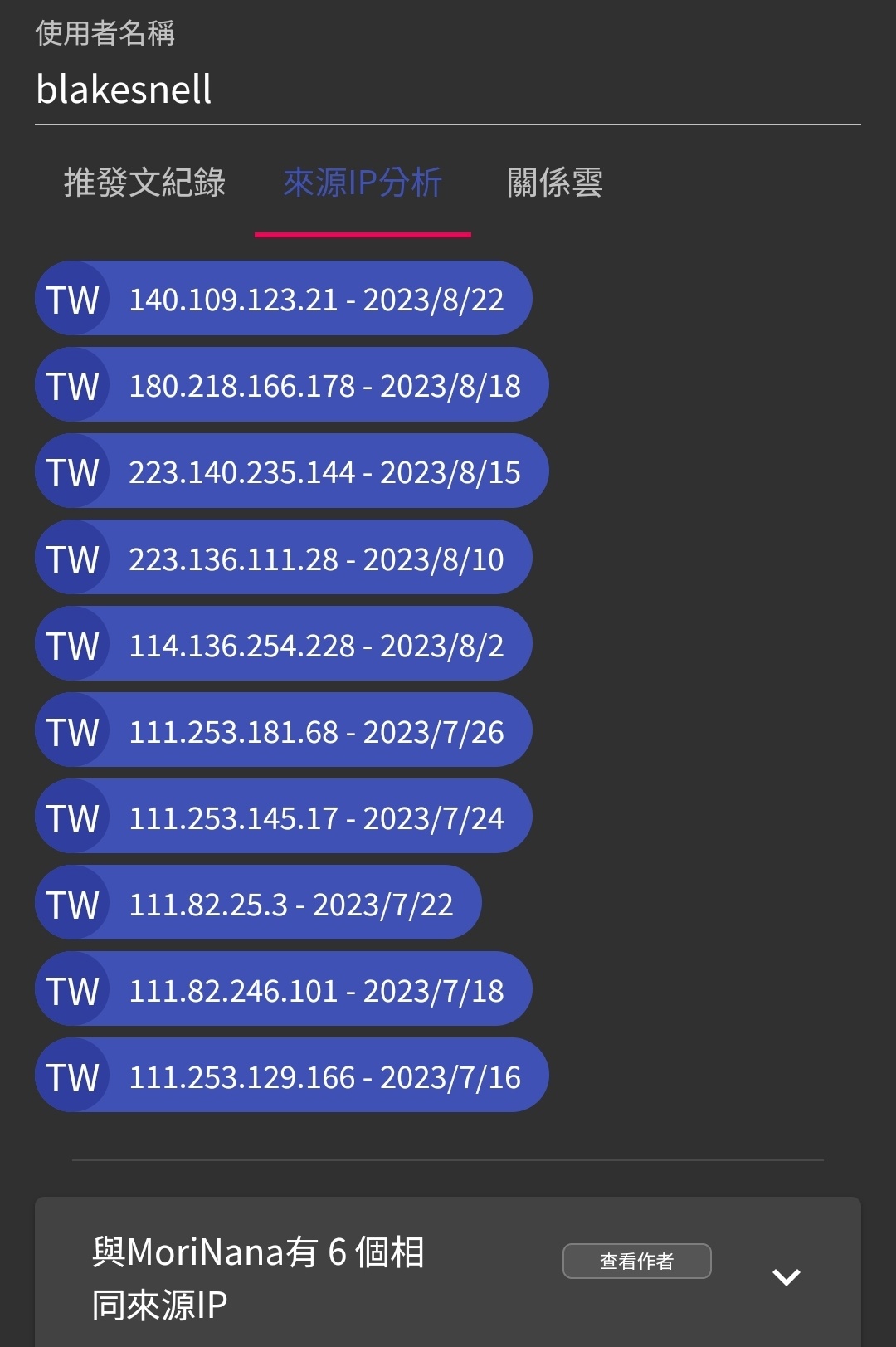 推 naya7415963 : 我查自己也和某個陌生帳號有滿多共同ip欸 08/22 18:58