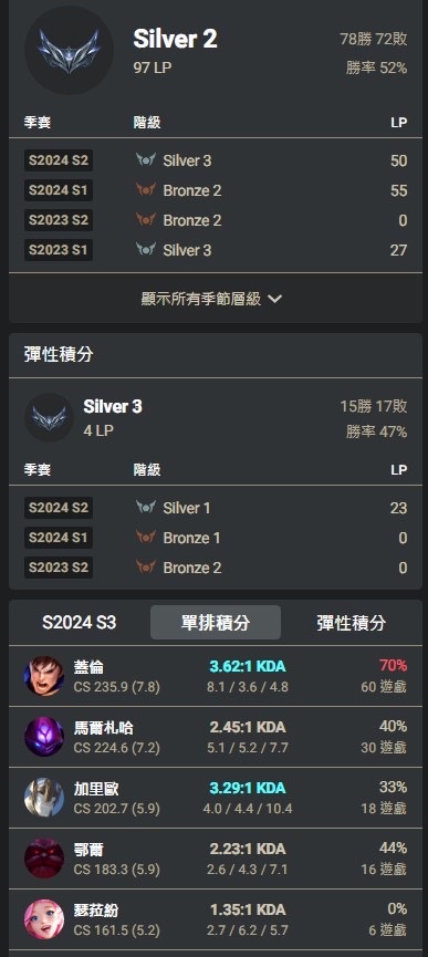 推 rey123123 : 我懂,我去年白金一,今年也是回鍋從銅牌一開始 12/03 16:22