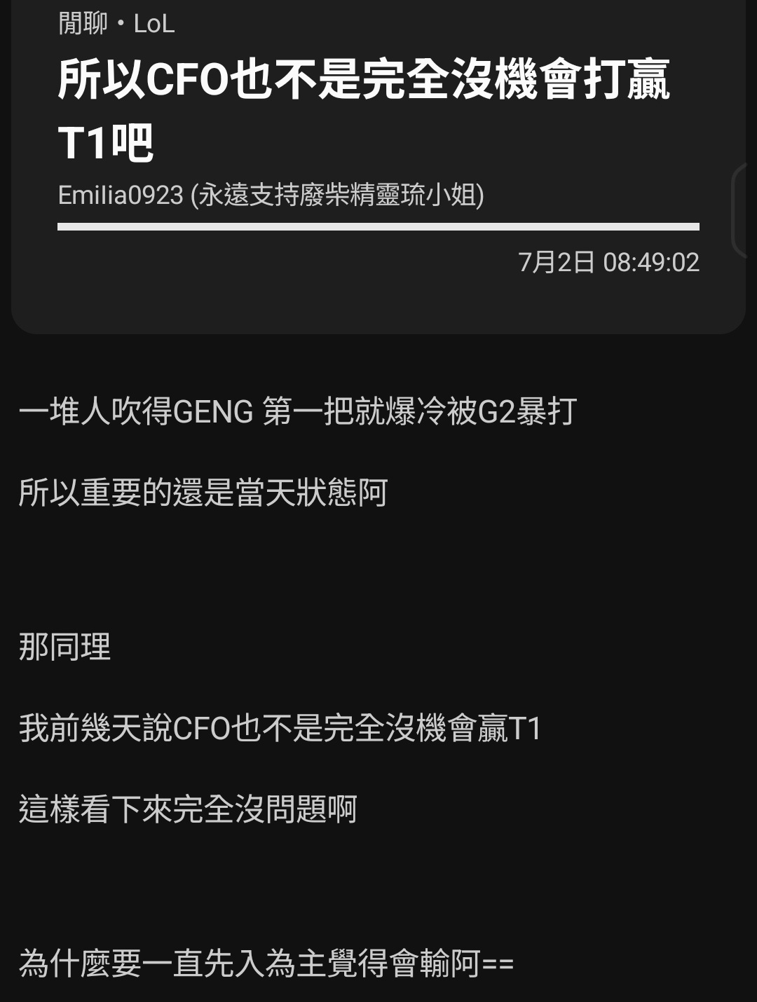 Akatsuki1006: 感覺真的0分 不如直接被t1 3:0 搞得現在那麼丟臉 07/04 11:09