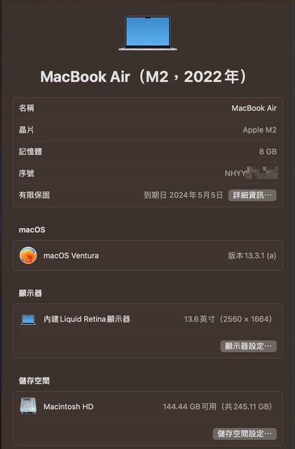 [型號] MacBook Air (M2, 2022)