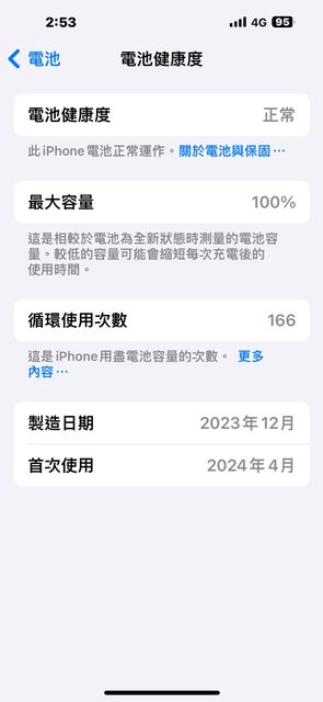 電池健康度100%,循環次數166次
