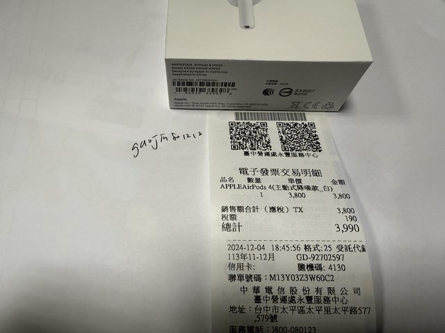 [商品照/補充說明] 中華電信神腦公司貨(2024/12/04)有使用Apple購物金折抵2000元 及