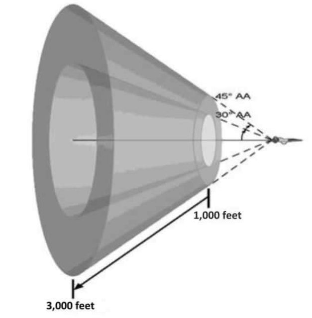個方位角30~45度,距離3000~1000呎的範圍,攻擊者會接近防禦者1200~1500的距離,