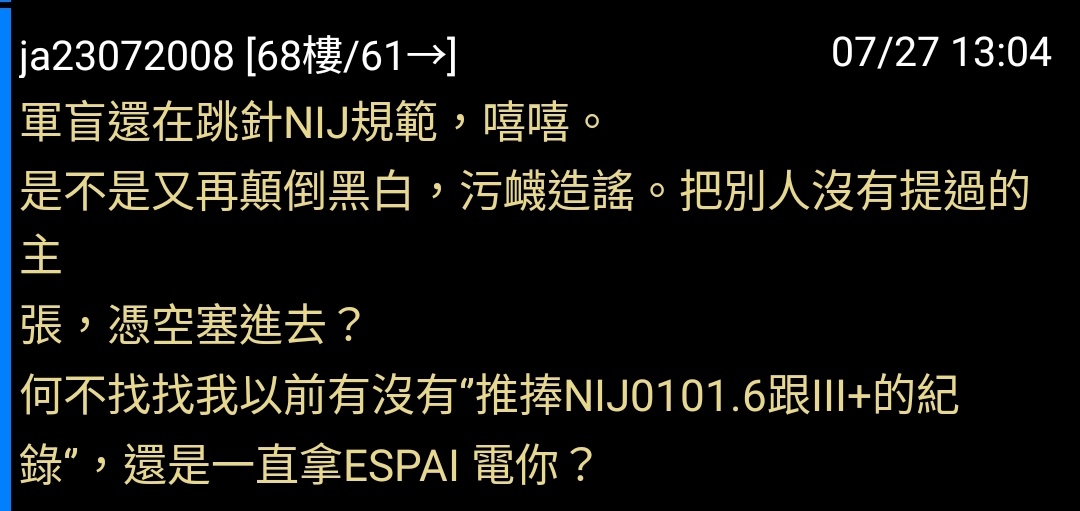 在這裡ejsizmmy主張要用NIJ警規06版本。之後他還會在06、07兩個版本間游移不定,顯