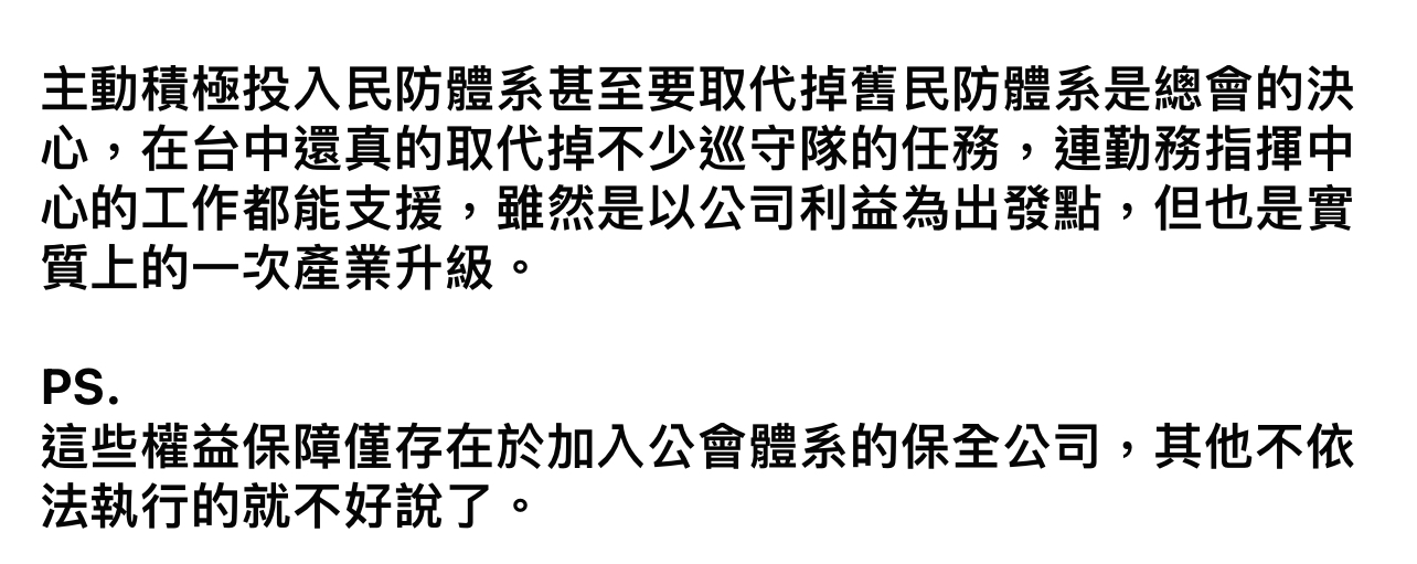 chyx741021 : 臉書上看到的,保全業似乎很積極地在推動參與民防 09/06 09:24