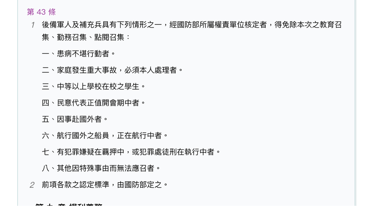 crow0801 : 動員徵召 那些情況可以免召 法律也有規定 09/06 19:24