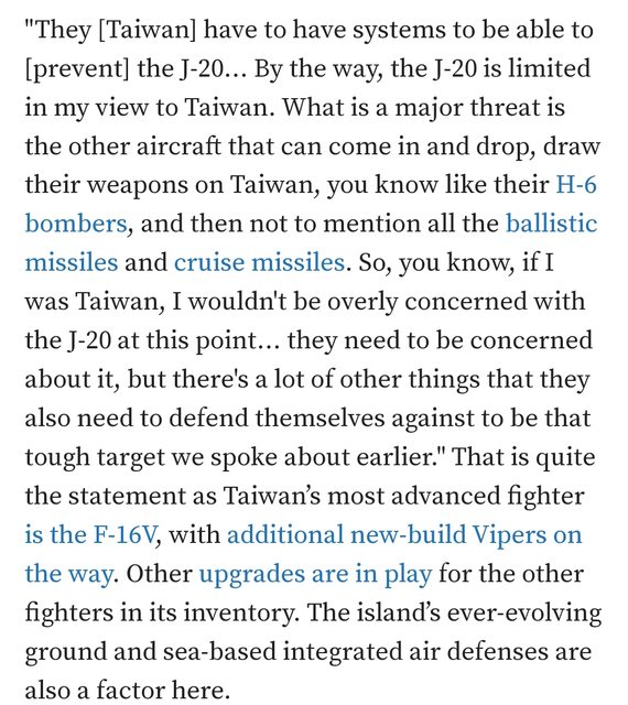 Wilsbach還在研討會上討論了J-20可能對台灣構成的潛在威脅 以及如果中國對台灣海峽進行軍事干預(特別軍事行動) 台灣將如何保衛自己 美國軍方官員先前表示, 解放軍可能有能力在2027年(甚至更早)之前發動戰爭 對於將軍來說,中國對台灣的威脅不應歸咎於J-20身上 “他們(台灣)必須擁有能夠(阻止)J-20 的系統 順便說一句,在我看來台灣雖然需要面對J-20的威脅 但更大的威脅是能夠對台灣進行武器投射的飛機 你比如他們的H-6轟炸機,然後更不用說所有的彈道飛彈和巡弋飛彈了 https://i.imgur.com/Cfdg79m.jpg