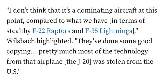 沒聽過? 沒關係☺ 這一位美國太平洋空軍的將軍在去年的時候發表了 他認為J20不是值得讓他失眠的東西 隨後呢 前陣子在DC舉辦的2023年空軍與太空部隊協會年度研討會當中 認為與美國空軍目前擁有的F-22和F-35 相比 J20目前還不是一種能夠占據主導地位的飛機 Wilsbach特別強調說 "他們做了一些很好的複製 J20那架飛機的大部分技術都是從美國偷來的https://i.imgur.com/k7FPVEq.jpg