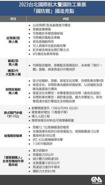 首頁 / 政治 新式戰鬥步槍XT-112亮相 多項升級戰力大增 2023/9/13 18:43(9/14 13:17 更新) 2023台北國際航太暨國防工業展14日起將在台北南港展覽館舉行,國防部13日展前記者會 搶先曝光「國防館」展示內容,包含新型戰鬥步槍XT-112也在展出之列。中央社記者張新 偉攝 112年9月13日 (中央社記者游凱翔台北13日電)國防部今天在國防展中披露最新、不曾公開的5.56公厘 新式戰鬥步槍「XT-112」,具備射擊精度(100公尺內9.8公分)及槍管壽命提升(1萬發 子彈),並導入人因工程等特色,更採國際規格戰術滑軌。 國軍推動實戰化射擊 臥跪立姿105秒連續射擊36發 2023年台北國際航太暨國防工業展14至16日將在台北南港展覽館登場,無論是參展廠商、 攤位均突破歷屆規模;國防部提前在下午於南港展覽館舉行展前記者會,披露國防館各項 軍品,秀出台灣近年推動國防自主的成果。 軍民用無人機在俄烏戰場立戰功,台灣急起直追發展無人機技術,此次國防館亮點,分別 是首次對外公開的「巡飛彈2型」無人機、小幅度研改的「銳鳶2型」無人機、劍翔反輻射 無人機(衛星定位攻擊、目標影像攻擊)、研改後的近程戰術無人機;另外,也有新型戰 鬥步槍「XT-112」、偵蒐戰術輪車、新式勇鷹高教機模擬器。 新型戰鬥步槍XT-112部分,現場軍方人員分析,此槍具有「射擊精度提升」、「槍管壽命 提升」、「人因工程」等特色。 他指出,槍管部分採多邊形加厚槍管,精度從現行T-91步槍的100公尺射擊精度14.5公分 提升至9.8公分,槍管壽命從6000發提升至1萬發,且全槍多處導入人因工程設計,範圍包 括板機幅度、雙側彈匣扣、雙側拉柄、槍擊固定擋板等,讓射手能以左右手快速射擊。 此外,XT-112更採用國際戰術滑軌規格,可穩固結合各式共同開發的不同瞄準具、榴彈發 射器等,提升單兵作戰距離、穩定度及準確度;槍枝前方則有快展式戰術握把,以利射手 快速進行立姿等不同射擊姿勢。 相較過往的鋁製彈匣,此槍彈匣以複合材料研發而成,能避免過往「敲到會變形」狀況, 同時彈匣有可讀視窗,快速了解彈藥餘量。 XT-112基本的性能包括口徑為5.56公厘、射擊模式包括「單發、二連發、全自動」模式、 彈匣容量30發、有效射程600公尺。 另外,現場亦展出「XTS112式步槍雷指器」、「XTS112式近戰瞄準鏡」、「TS110式熱像 瞄準鏡」、「XTS112式雙倍式狙擊鏡」。(編輯:張均懋)1120913 https://i.imgur.com/20LC3gU.jpg